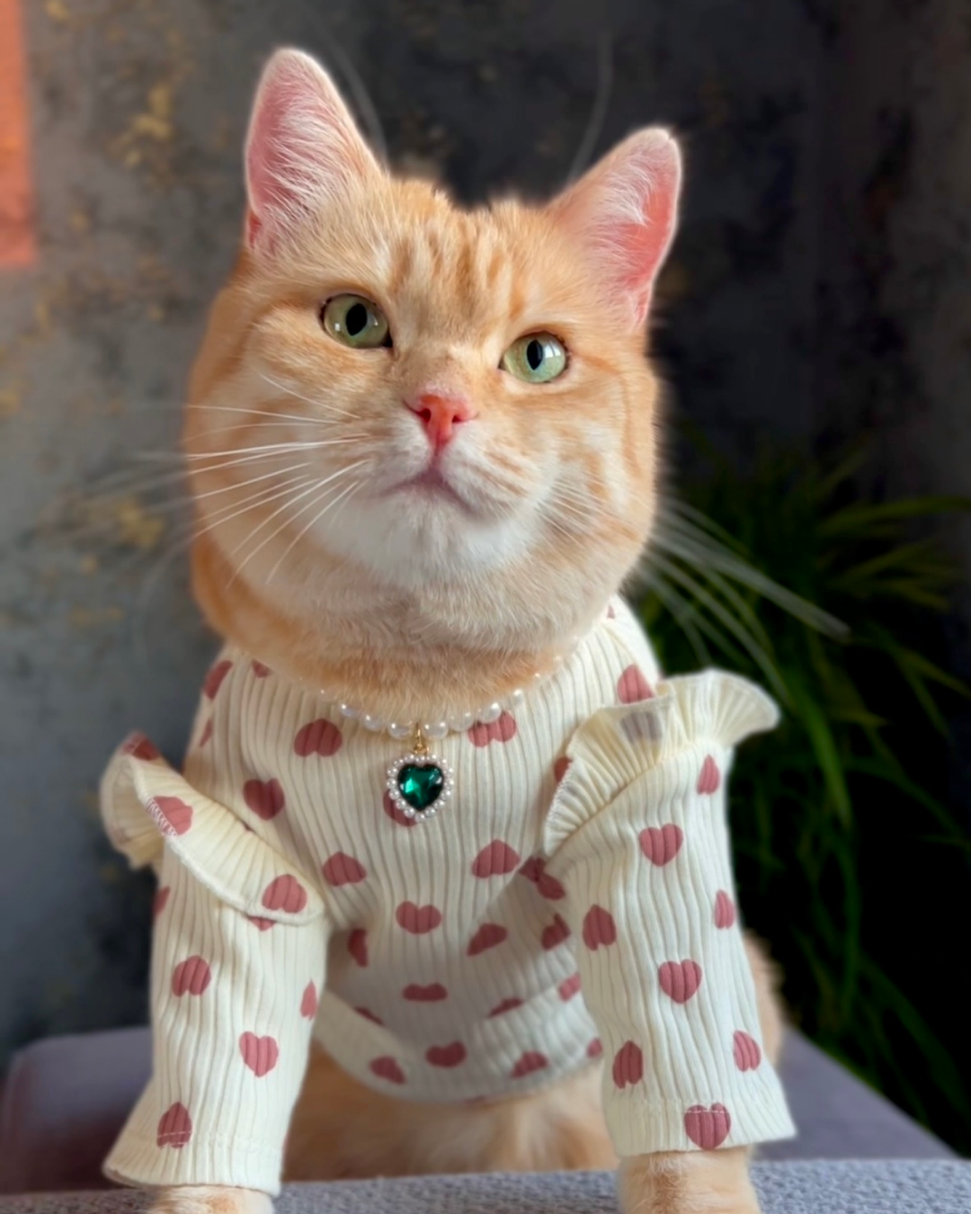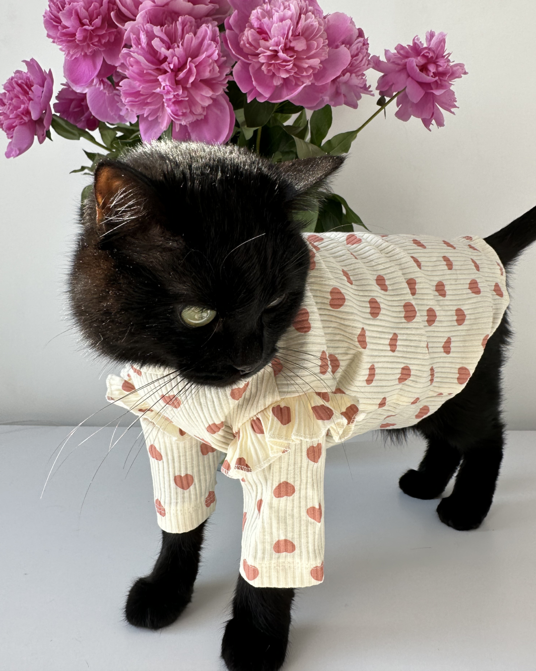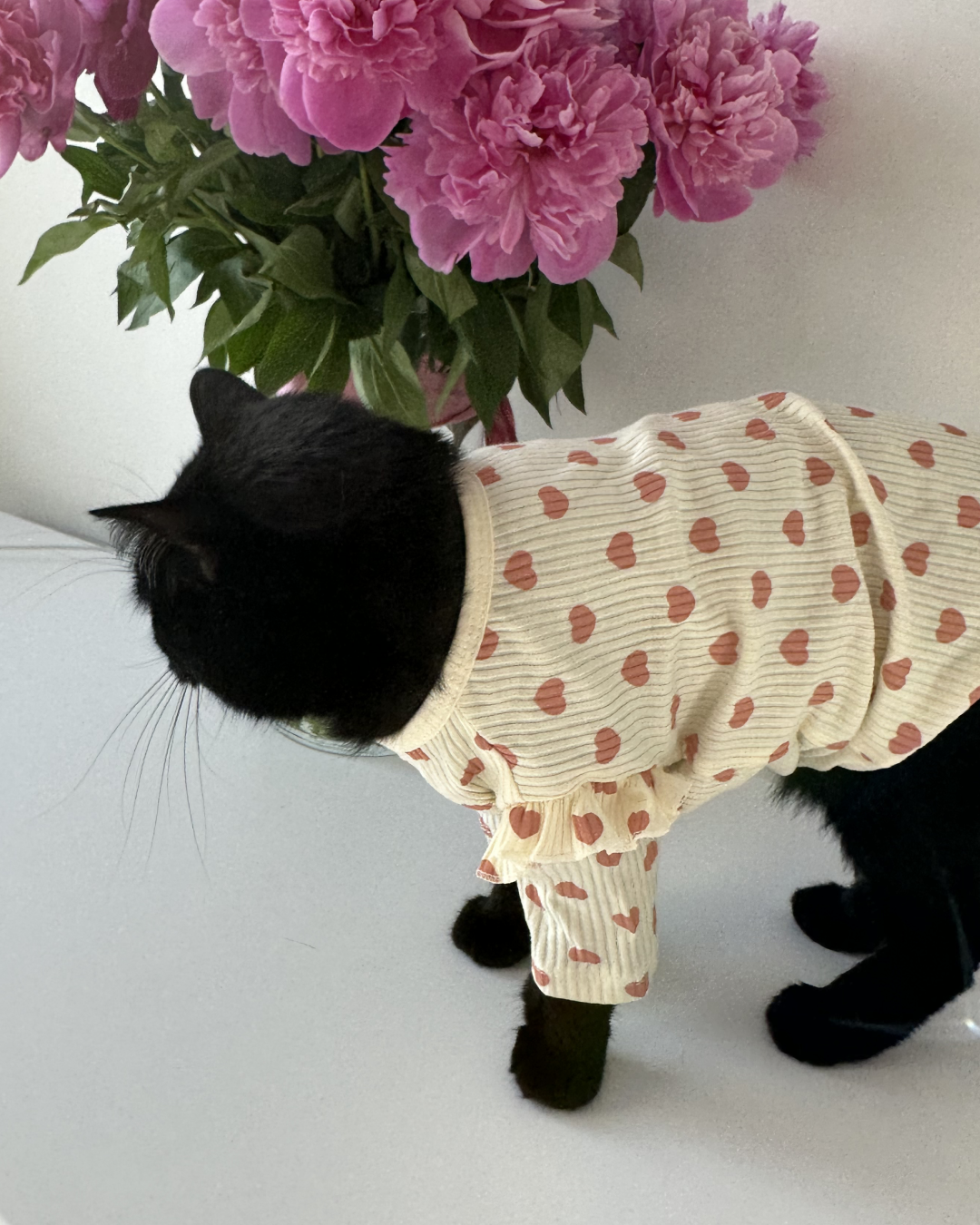 Ніжне платтячко з сердечками створене для тих моментів, коли хочеться максимум милоти. М’яка, приємна до тіла тканина з легкою текстурою добре тягнеться, не сковує рухів і комфортно сідає на котика. Акуратні рукавчики й делікатні рюші додають образу чарівності, а принт із сердечками робить його ще теплішим. Чудовий варіант для фотосесій, святкових днів або просто щоб ваш пухнастик виглядав неймовірно вдома.