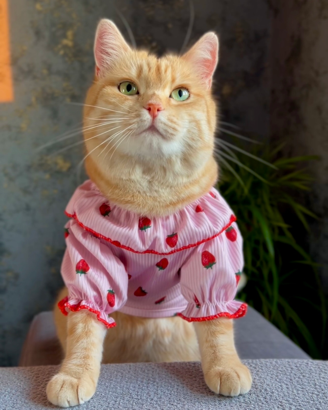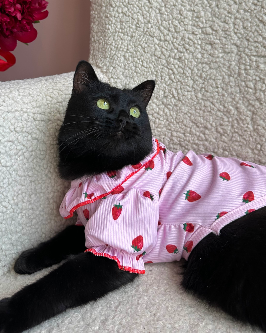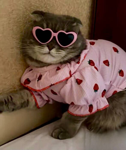 Ніжне платтячко з полуничками створене для справжніх котячих принцес! Легка тканина м’яка на дотик, добре тягнеться та приємно облягає, не сковуючи рухів. Матеріал комфортний навіть для чутливих котиків. А рюші та полуничний принт додають образу солодкого шарму, перед яким неможливо встояти.
