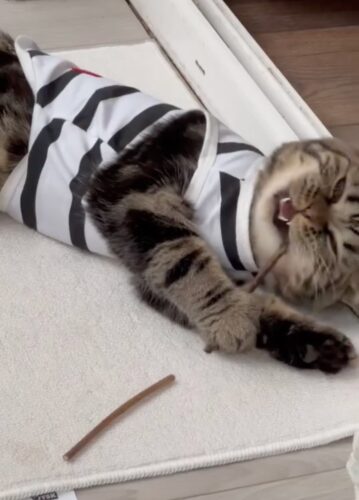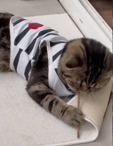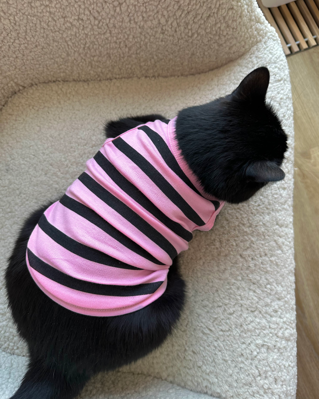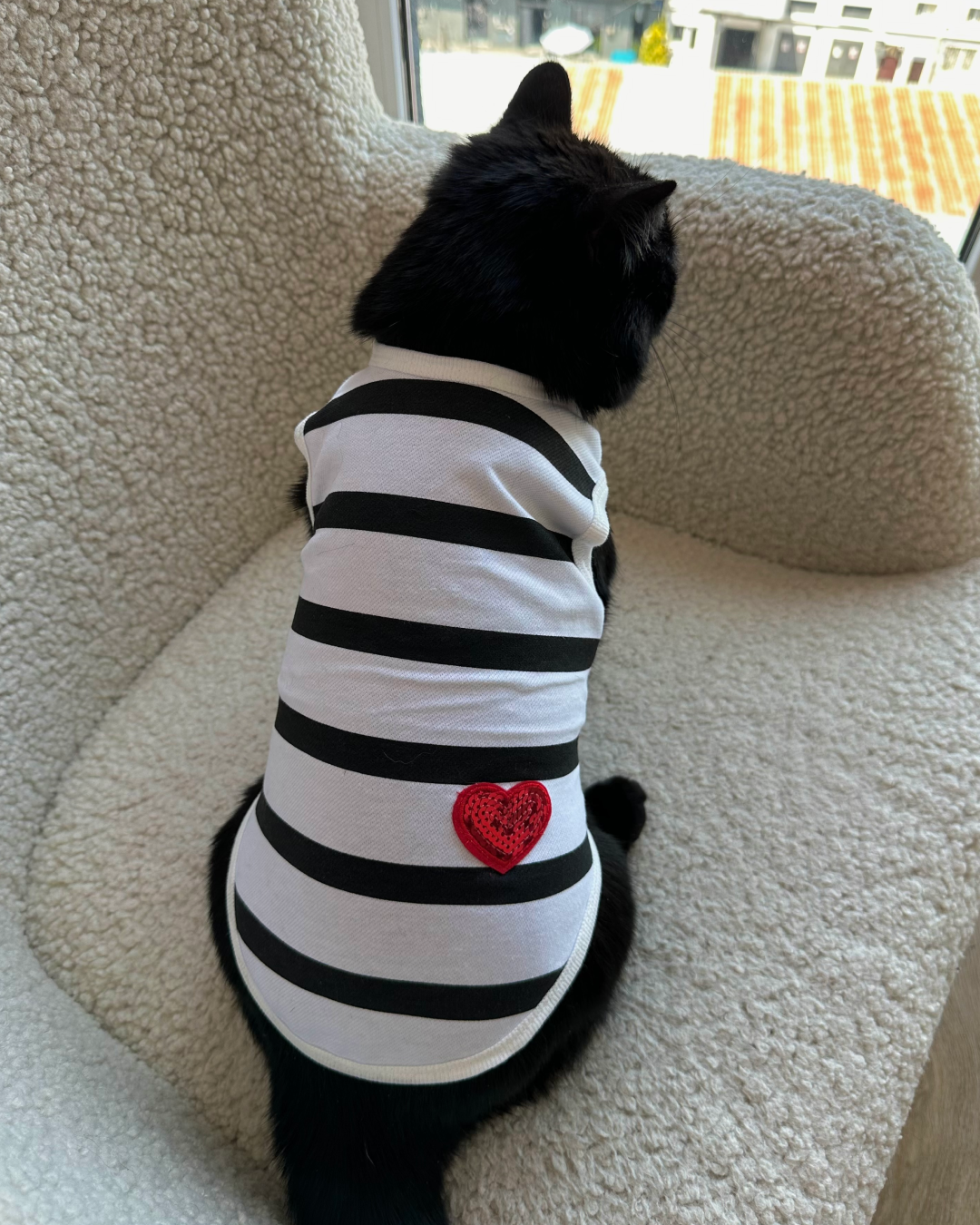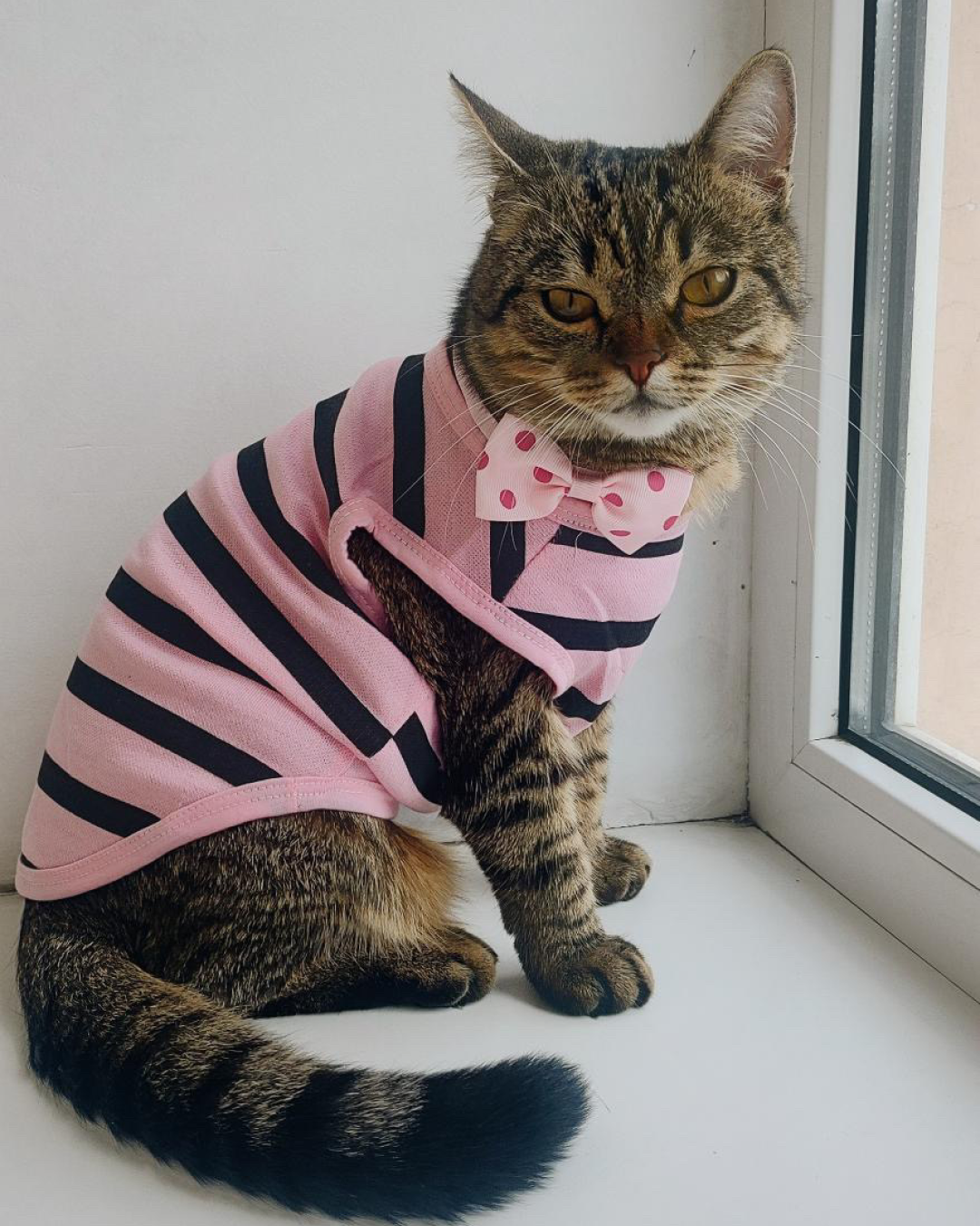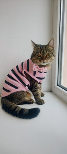 Легкі смугасті маєчки для котиків на кожен день доступні у двох принтах: чорно-білий із яскравим сердечком та ніжно-рожевий у смужку. Приємний до тіла матеріал, не парить і не сковує рухів, тож котику буде комфортно і вдома, і на сонячному підвіконні. Простий крій легко одягається, добре сідає по фігурі та підходить для теплої пори року або як стильний домашній образ.